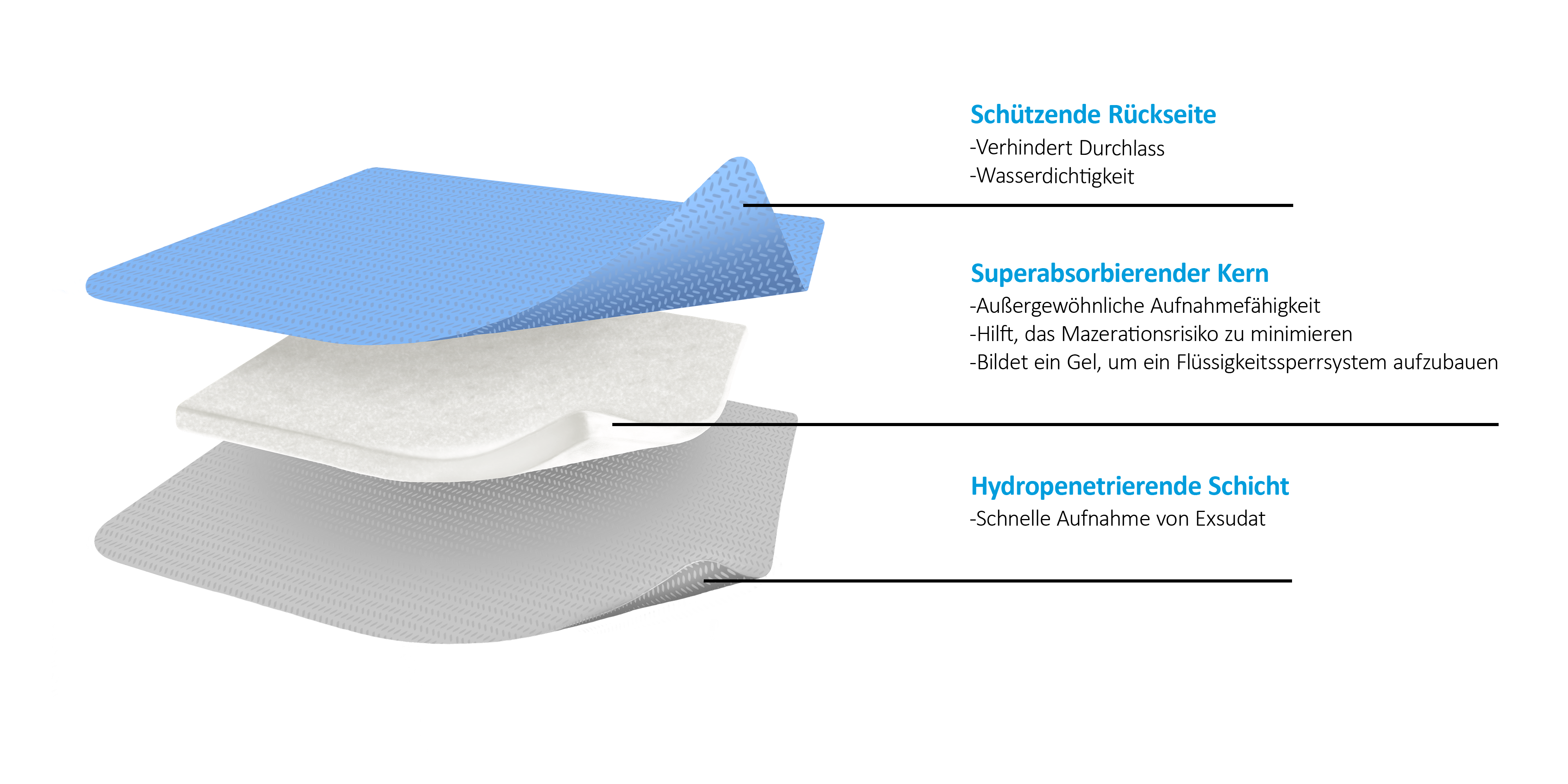 Die dreilagige Konstruktion erleichtert das Flüssigkeitsmanagement, um ein optimales, feuchtes Wundmilieu zu schaffen, das zu einem schnelleren Wundverschluss führt. Das Saugkissen bietet eine hervorragende Absorption und schließt Exsudate ein. Dadurch wird das Risiko einer Mazeration und einer Schädigung der Haut in der Wundumgebung minimiert.
