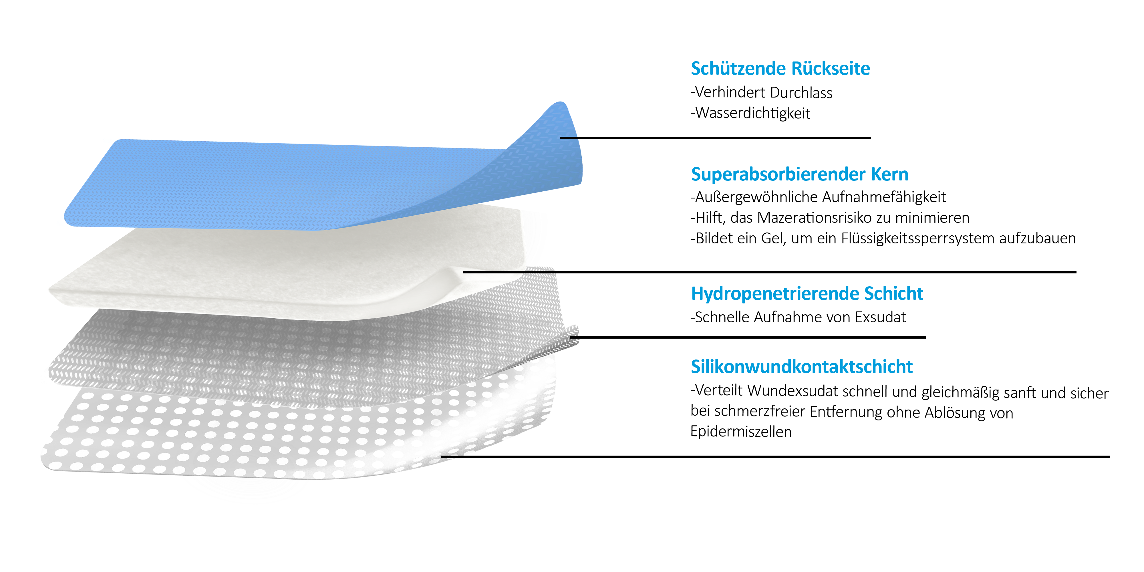 Die mehrschichtige Konstruktion erleichtert das Flüssigkeitsmanagement und sorgt für ein optimales, feuchtes Wundmilieu, was zu einem schnelleren Wundverschluss führt. Das saugfähige Kissen bietet eine hervorragende Absorption und schließt Exsudate ein. Dadurch wird das Risiko einer Mazeration und einer Schädigung der Haut in der Wundumgebung minimiert.