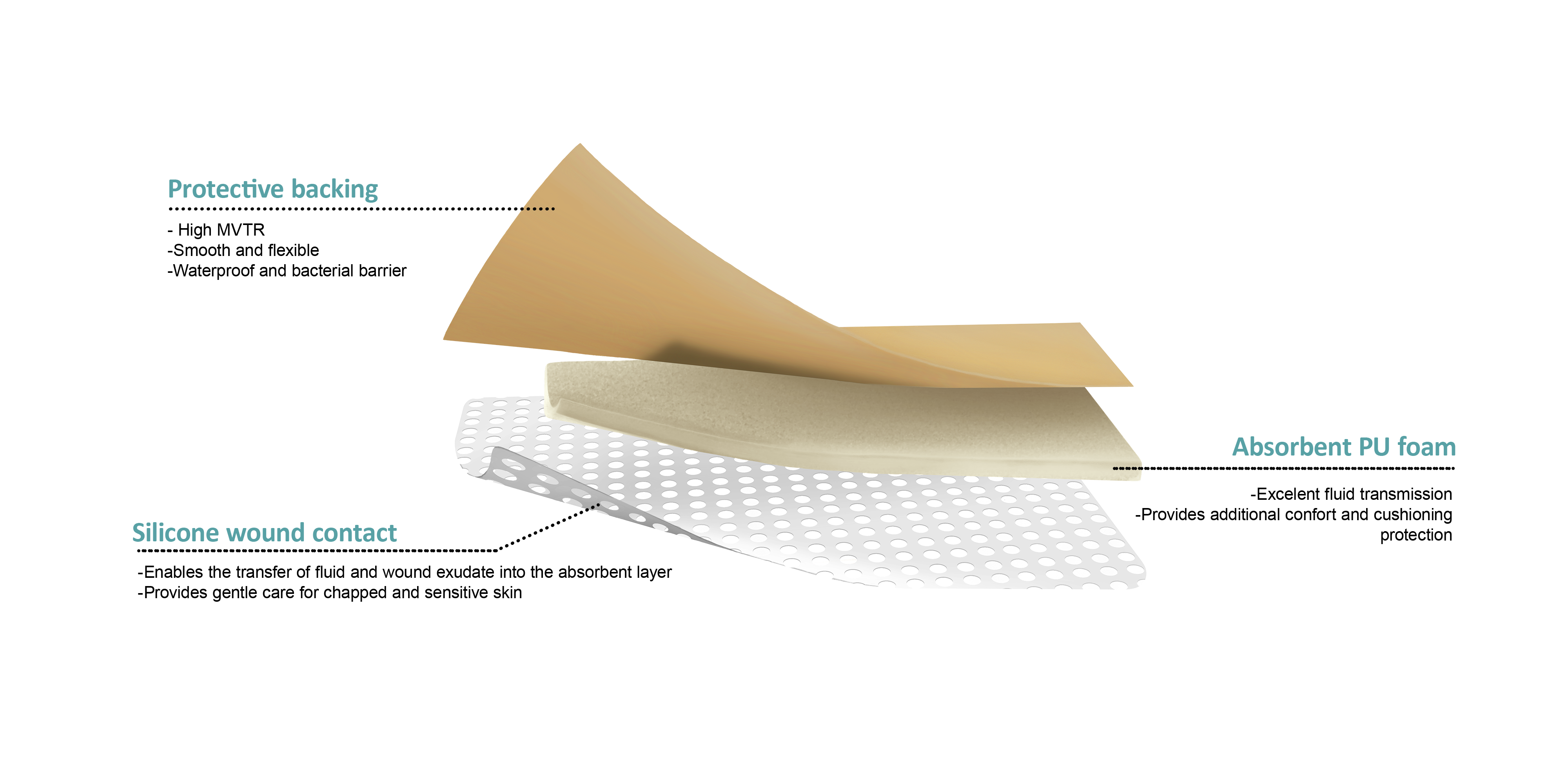 The soft silicone layer can be lifted and repositioned without losing adhesion. In addition, this layer can minimize pain as well as injuries to wounds and the surrounding skin. The absorbent pad layer provides excellent absorption and locks in exudate.